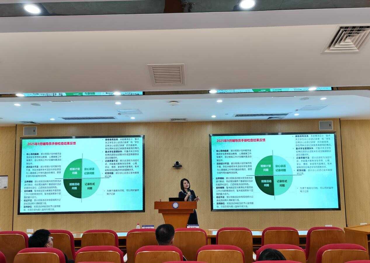 隨后,教育處負(fù)責(zé)人鄭小潔通報《輔導(dǎo)員工作手冊》核查情況,明確記錄規(guī)范并提出改進(jìn)建議,分享學(xué)生思政及心理健康教育工作實用方法與技巧,切實推動學(xué)生管理與心理健康工作向標(biāo)準(zhǔn)化、精細(xì)化邁進(jìn)。